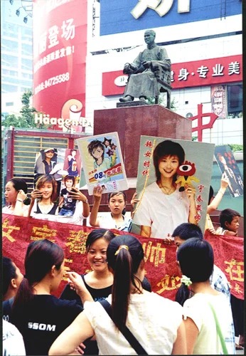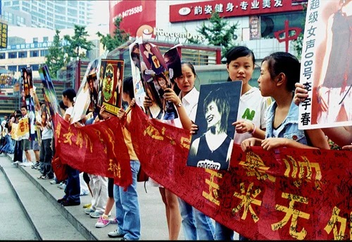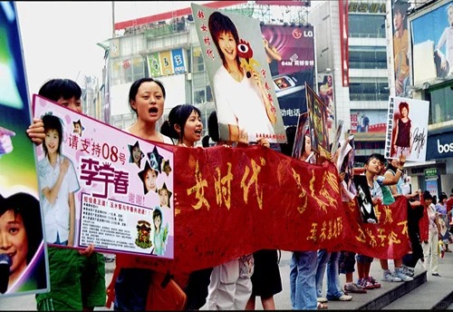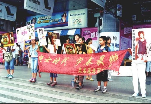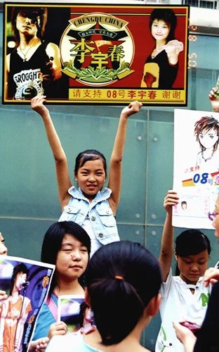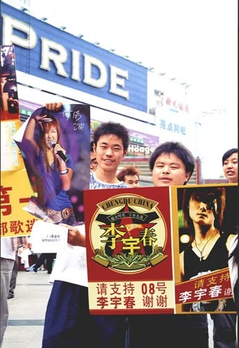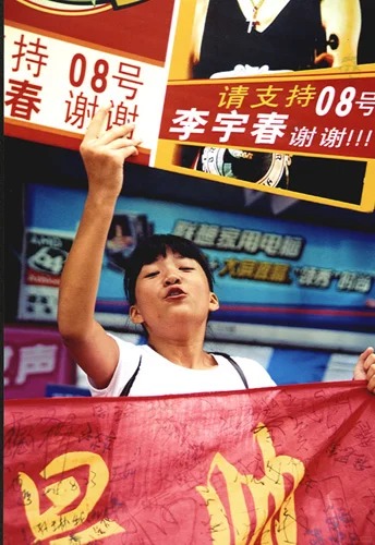 2005年8月,超女总决赛即将开始,粉丝们纷纷拿起自制的拉票海报走上街头,号召市民“短信投票”