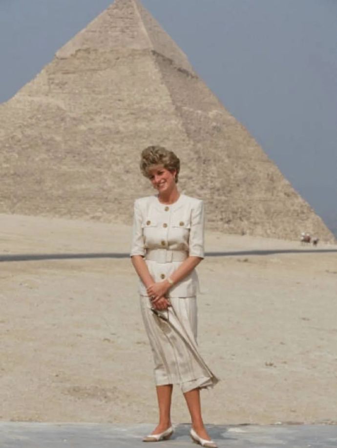 > 1992年访问埃及期间,戴安娜王妃站在金字塔前拍照
