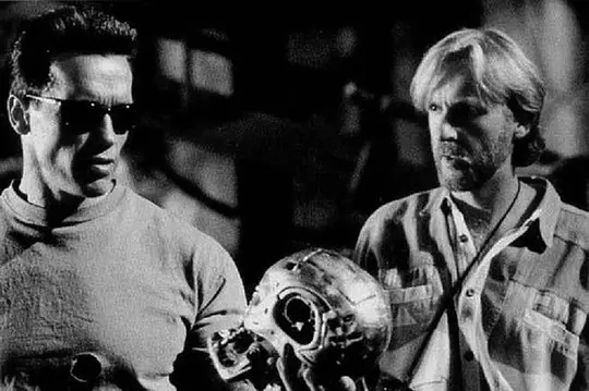 1990年,施瓦辛格与卡梅隆在《终结者2:审判日》片场