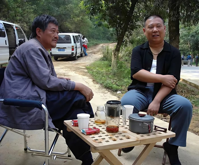 2007年,电影《落叶归根》拍摄期间,主要演员赵本山和郭德纲在一起留影。