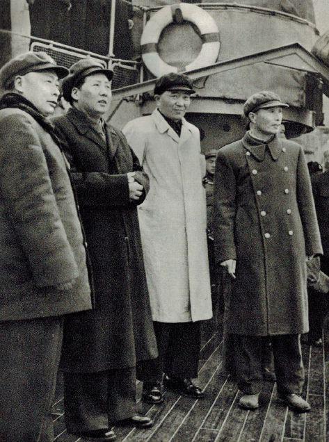 1953年,公安部长罗瑞卿陪同毛泽东主席视察南昌舰。左一为陈毅同志,右一为张爱萍同志。