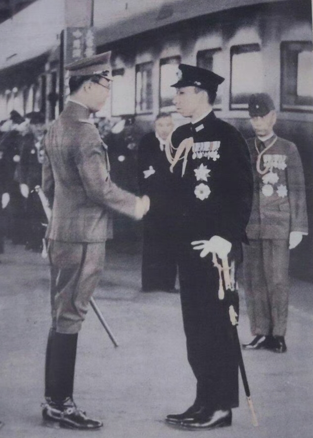 1942年溥仪在伪满洲国新京(长春)火车站迎接日本高松宫宣仁亲王的一张照片,此次会面是为庆祝伪满洲国“建国”十周年。