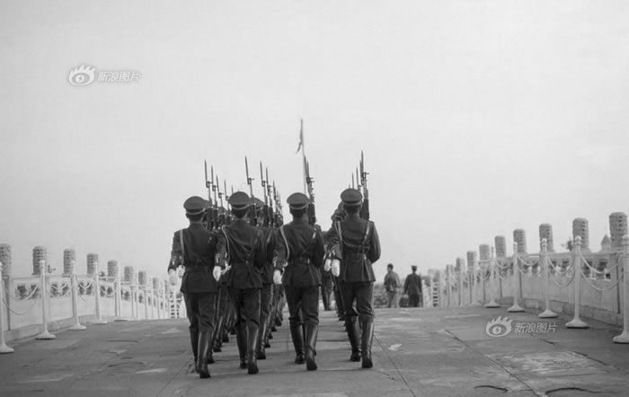 在天安门前留个影,从五十年代至今,一直是国人夙愿。如今,人们也乐于与广场上的武警合影。天安门从1417年修建,历经战火和沧桑。新中国成立后几次大修,至今近600年,巍然依旧。图为1993年,走过天安门前金水桥的武警。