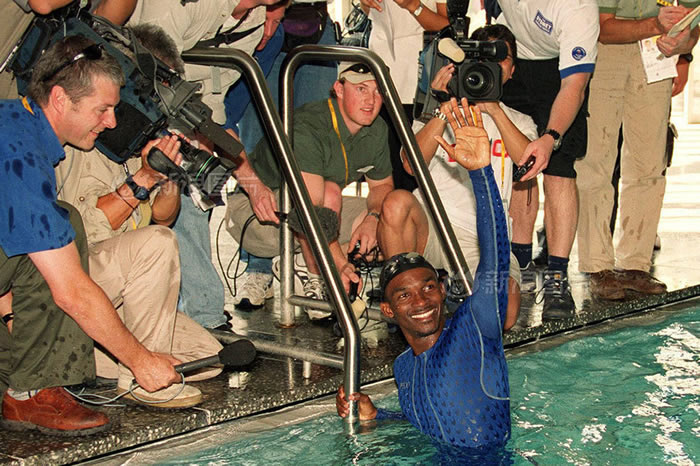 【他创造了最慢世界纪录!】2000年悉尼奥运会,男子100米自由泳比赛,赤道几内亚选手埃里克·莫桑巴尼获得了最后一名,成绩创造了奥运史上该项目的最慢纪录,但他像冠军一样开心。为了推广游泳运动,国际奥委会破例让他持外卡参赛,他只训练了8个月。