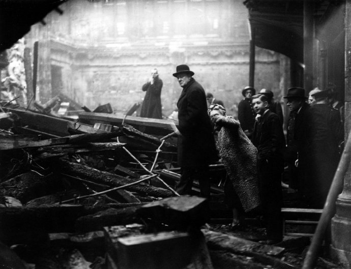 1940年,伦敦,丘吉尔和他的妻子在一次轰炸后检查城市破坏情况