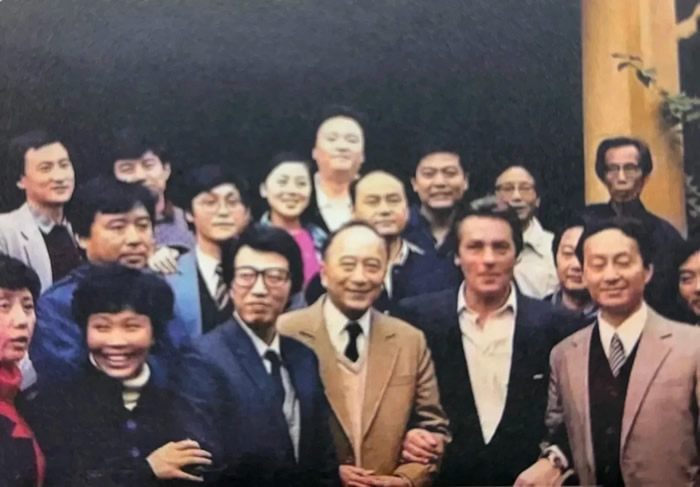 1987年阿兰·德龙参观上海电影译制片厂。前排左起丁建华、杨成纯、孙道临、阿兰-德龙、童自荣,中排左起吴鲁生、季兴根、狄菲菲、孙渝烽、程玉珠、顾加全、杨文元,后排左起沈晓谦、任伟、盖文源。童自荣后面露半个脸的是乔臻