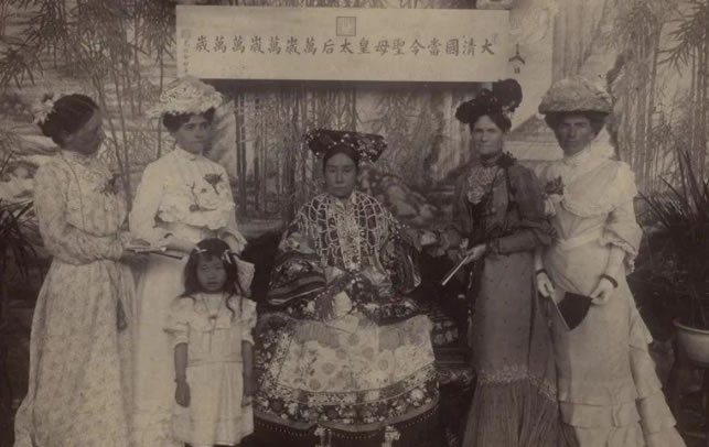 1903年(光绪癸卯年),慈禧太后在颐和园乐寿堂,与外国公使夫人及家眷的合影。当时慈禧为了缓和因沈荩案引发的外交舆论压力,特意在重阳节设宴接待外国使节夫人。
