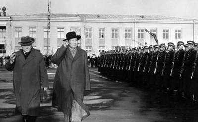 1957年11月,毛泽东主席率中国代表团出访苏联,参加十月革命胜利40周年庆典活动和共产国际莫斯科会议。图为欢迎仪式上检阅苏联三军仪仗队的毛泽东