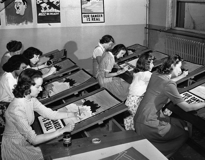 1942年7月8日,纽约州华盛顿港,女学生组成的艺术流水线正在忙着复制二战宣传画。原画挂在照片的背景中。