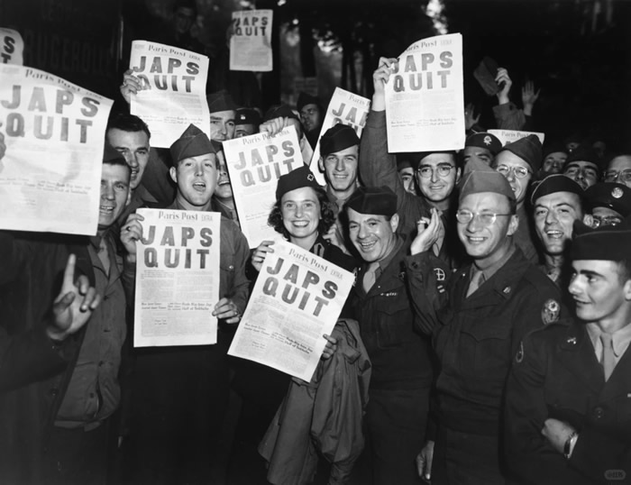 1945年5月,驻扎在巴黎的美军士兵正在看美军军报《星条旗》 ,头版新闻是 《希特勒死了》