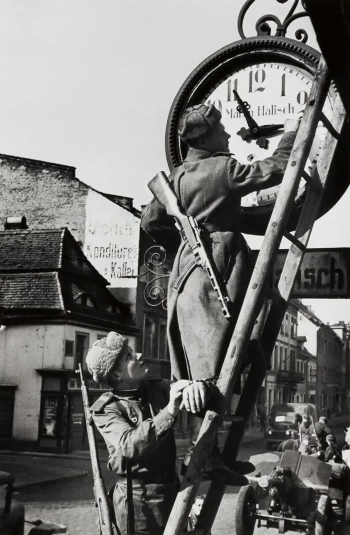 1945年5月柏林,两名苏联红军战士将时钟调整到莫斯科时间。