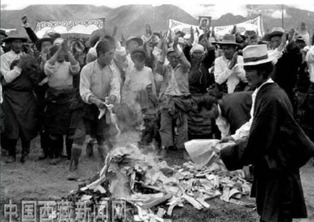 1959年,西藏,农奴们烧毁卖身契,庆祝获得自由