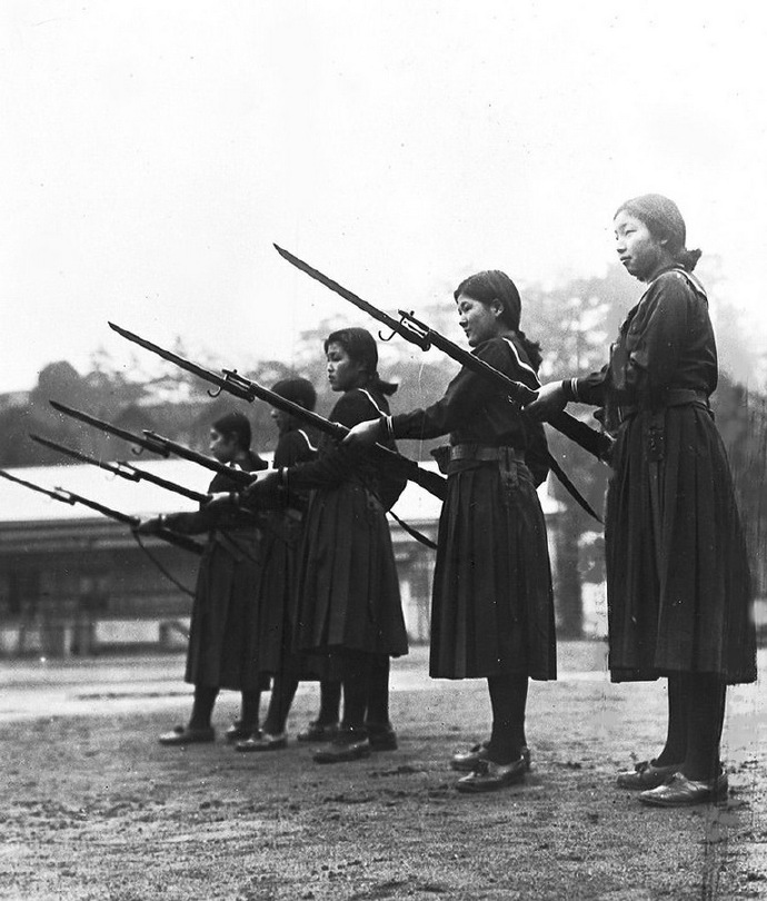 1937年,东京,高中女生学习步枪和刺刀的基本战斗技能