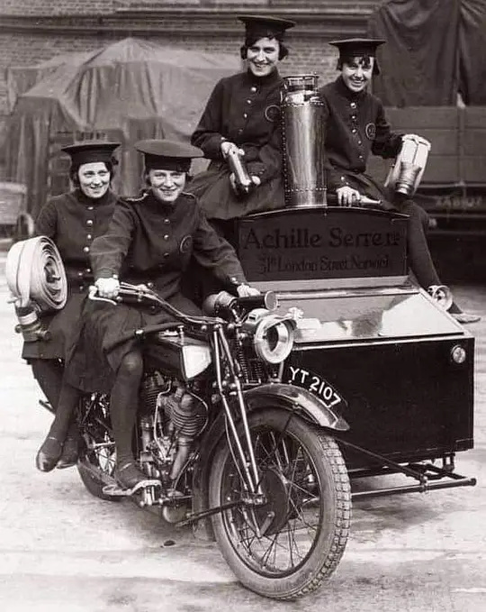 1932年伦敦,驾驶改装摩托车出行的女性消防队。