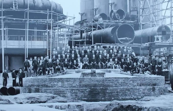 正因八幡制铁一开始就被定位为战略性的钢铁公司,因此,当它的一号高炉竣工时,明治朝廷的重臣伊藤博文(前排正中)和井上馨(前排中间衣服颜色不同、身体靠右的那个)都前来参加典礼。