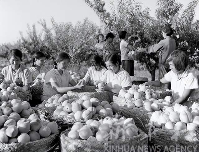 1972年,著名的深县蜜桃又获丰收。这是县果林场的工人在收蜜桃。