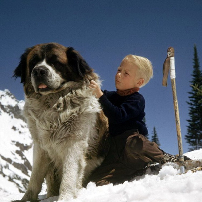 1947年,美国爱达荷州,一个小男孩和他的圣伯纳德犬在滑雪胜地太阳谷
