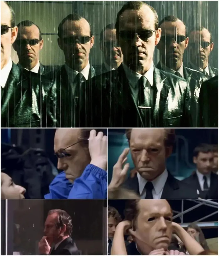 《黑客帝国:矩阵革命》中最后的雨中大战,特工克隆大军,其实是一个个和演员雨果维文体型身高差不多的群众演员,想象一下演员在现场看到这么多个自己,围着自己有多惊悚…