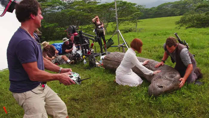 《侏罗纪世界》片场花絮,对于一些和人类有接触的恐龙场景,续作依然继承了前作的传统,使用了真实的恐龙道具。