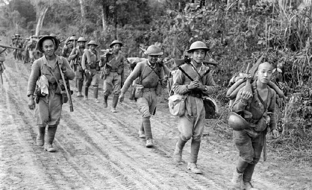 【远征军在行军】每当提到远征军,笔者总会想到《国民革命军新一军知识青年从军歌》。这首军歌里面有这样的话语:“昂然含笑赴沙场,大旗招展日无光,气吹太白入昂月,力挽长矢射天狼。采石一战复金陵,冀鲁吉黑次第平,破波楼船出辽海,蔽天铁鸟扑东京一夜捣碎倭奴穴,太平洋水尽赤色,富士山头扬汉旗,樱花树下醉胡姬。”