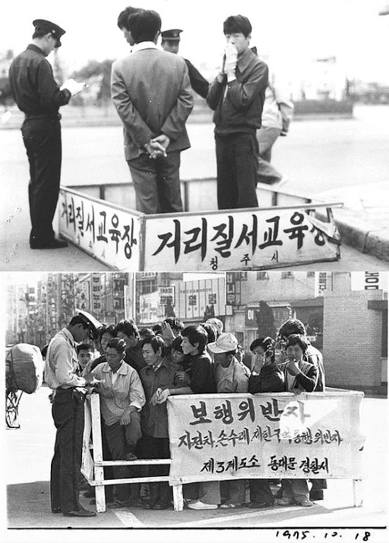 1975年10月18日,韩国乱穿马路的人被迫站在“耻辱箱”里30分钟。