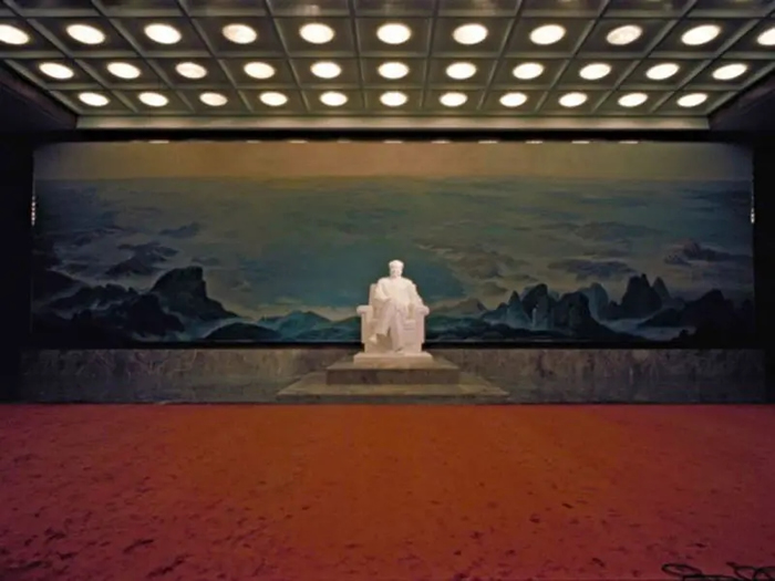 1977年5月,刚刚竣工的毛主席纪念堂北大厅内,正中放着毛主席汉白玉坐像,背景是一幅《祖国大地》绒绣。